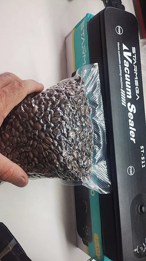 A seladora remove o ar das embalagens, prevenindo a oxidação e mantendo os alimentos frescos por mais tempo.